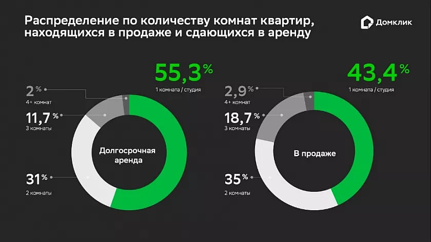 Жильё, сдающееся в долгосрочную аренду, в среднем меньше по площади, чем выставленное на продажу — аналитики Домклик